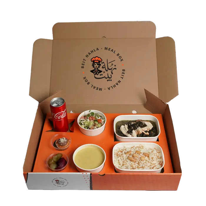 Molokhia leaves cooked with garlic, chicken, and lemon, served with vermicelli rice, Arabic salad, lentil soup, dessert, and a soft drink.