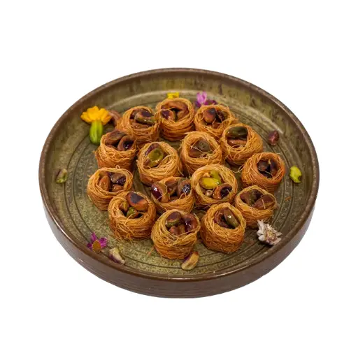 Shredded phyllo dough nests filled with pistachios and sweet syrup.